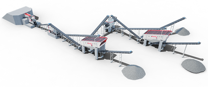 1、破碎:需加工物料經(jīng)振動給料機被均勻連續(xù)的送至顎式破碎機中進行粗碎,經(jīng)輸送機送至反擊式破碎機中進行細碎,再由振動篩進行篩分。